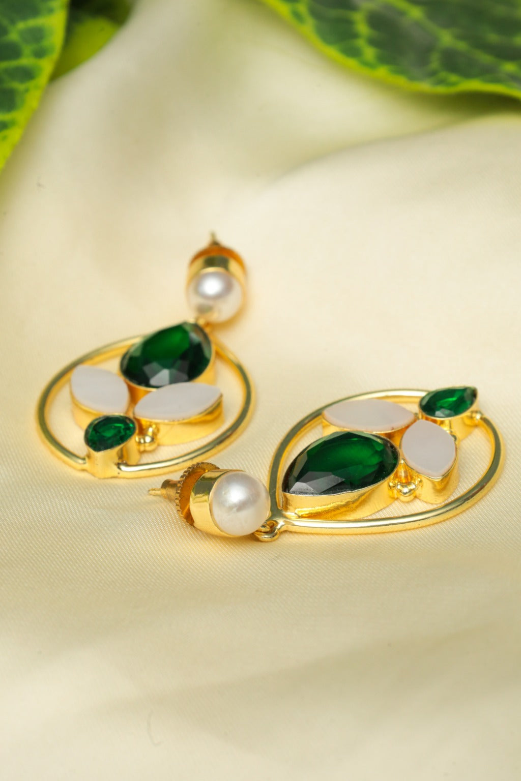 These gold plated green lotus drop earrings feature an oval green gemstone paired with a white lotus-inspired stud adorned with tiny faux pearls, creating a festive and elegant statement accessory.