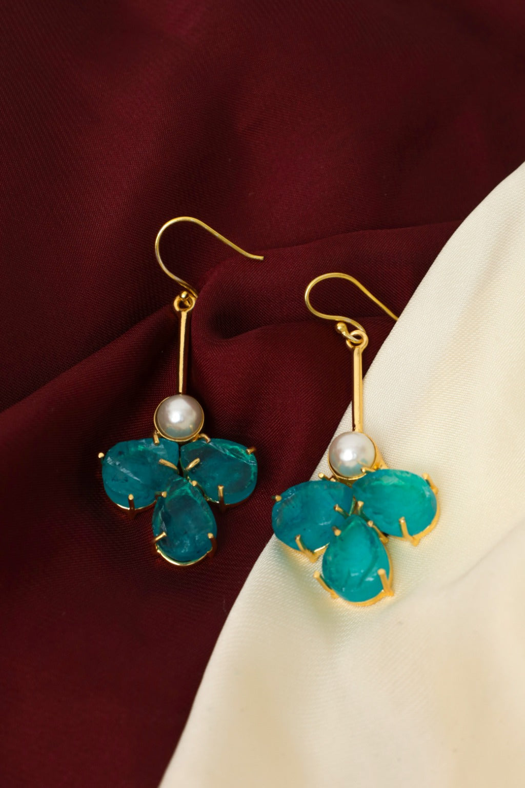 The Gold-Plated Turquoise Pearl Drop Earrings feature natural, unpolished turquoise stones paired with delicate white pearls in a gold-toned frame. The raw stones create a bohemian, artisanal look, while the gold setting adds elegance, making these earrings perfect for casual or formal occasions.